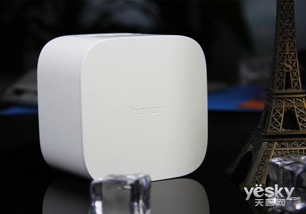 荣耀路由2S白色的造型远远看去更像是一个小方盒,产品三围尺寸为105*105*78mm,裸机重量约为260g,方盒的边角处进行了圆润处理,整体感觉更显灵动。