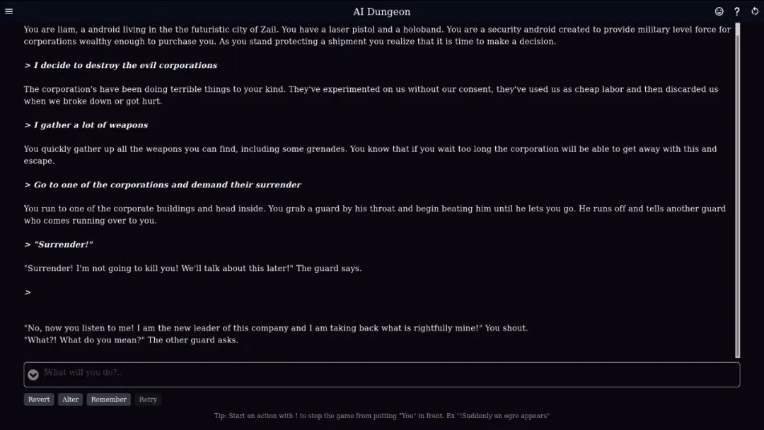 AI Dungeon 像一本玩家跟AI共同编写的小说,游戏中只有文字而不存在任何图形,玩家负责输入简单语句来控制角色的动作和对话,而AI则负责续写玩家文本后续的情节发展。