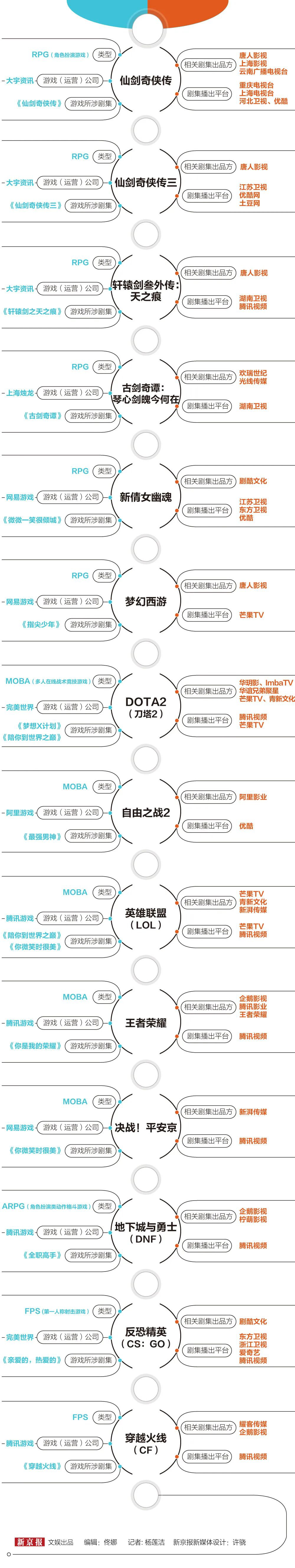 种类繁多的电子游戏,哪些更容易成为“剧游联动”的宠儿?统计数据显示,2005年以来的16部与电子游戏相关、又具有一定影响力的剧集,共涉及了6家游戏运营商旗下的14款游戏。其中,角色扮演类游戏(RPG:Role-playing game)最多,有7款,含角色扮演类动作格斗游戏(ARPG)一款,即《地下城与勇士》,其他的RPG包括《仙剑奇侠传》《梦幻西游》《新倩女幽魂》等;多人在线战术竞技游戏(MOBA:Multip Online Battle Arena)5款,包括《刀塔2》《英雄联盟》《王者荣耀》等;第一人称射击游戏(FPS:First-person shooting game)2款,为《反恐精英》和《穿越火线》。
